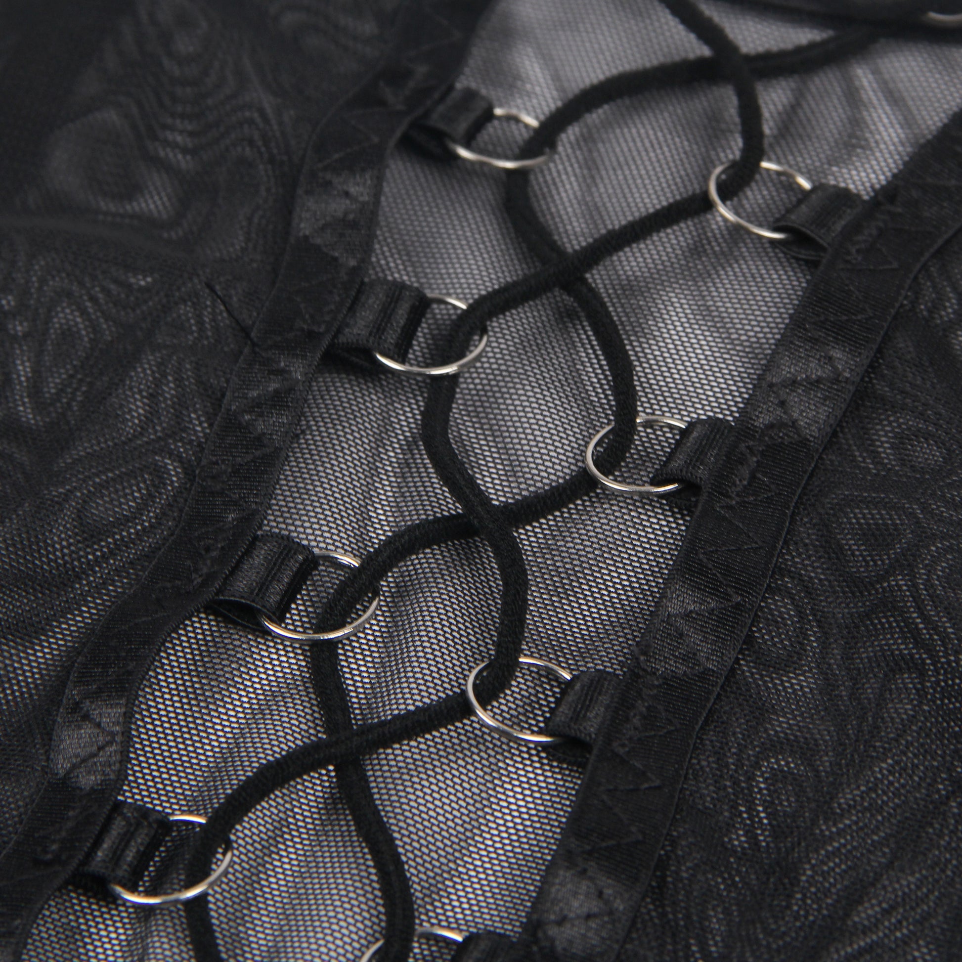 Slip into pure temptation with this three-piece set that whispers confidence and desire. The black mesh bra features delicate lace-up garter details that frame your silhouette with understated allure, while the matching garter belt cinches with a customisable lace-up back for a perfectly tailored fit. The included thong completes the ensemble with effortless sensuality, and the leg rings add an unexpected edge—a daring flourish for those who embrace their boldest self. Elegance meets seduction in every carefully crafted detail.